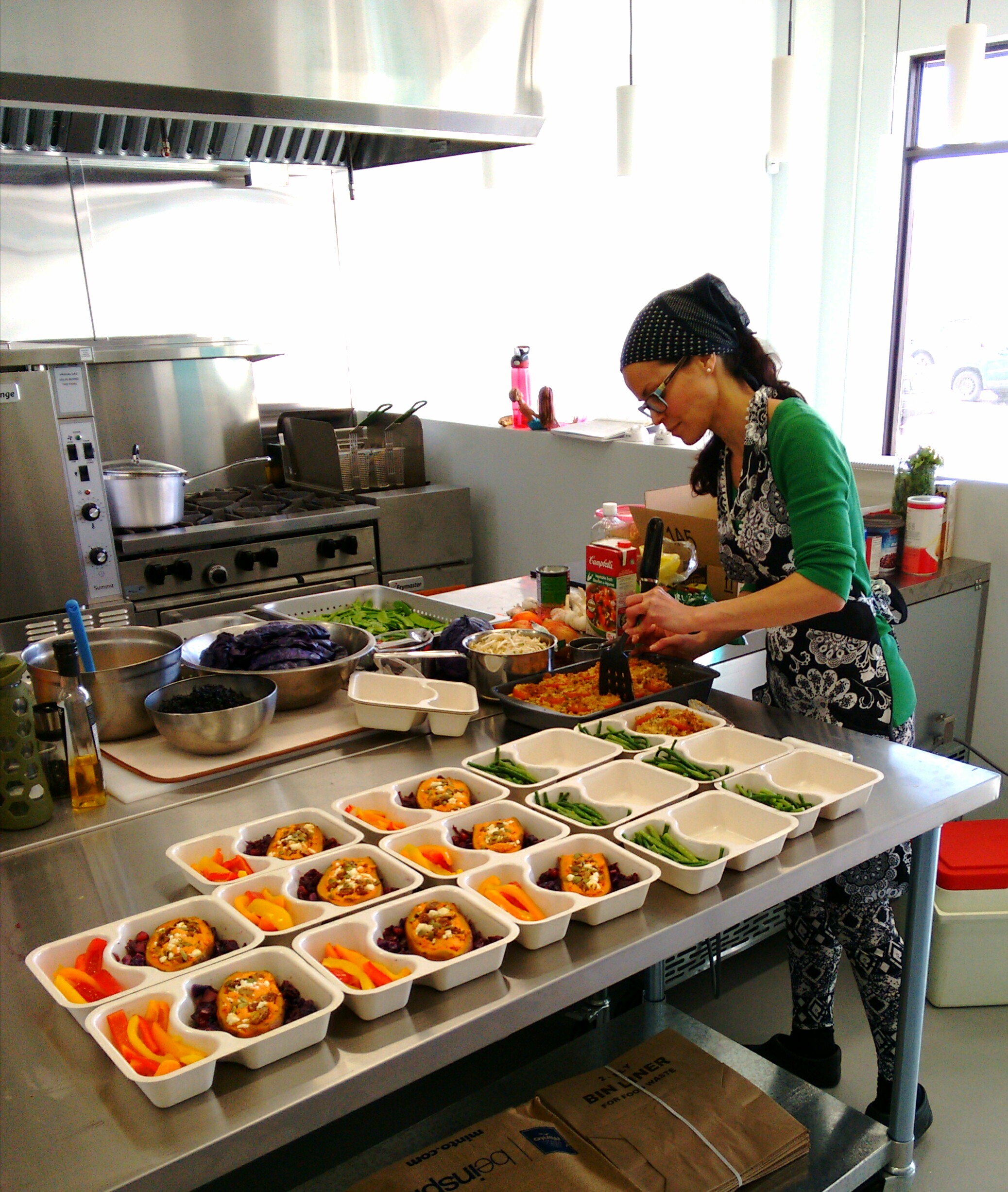 February 1, 2016February 1, 2016 by thecauldronkitchen The Kneaded Kitchen Photos woman cutting into a pan to portion the food into its packaging.