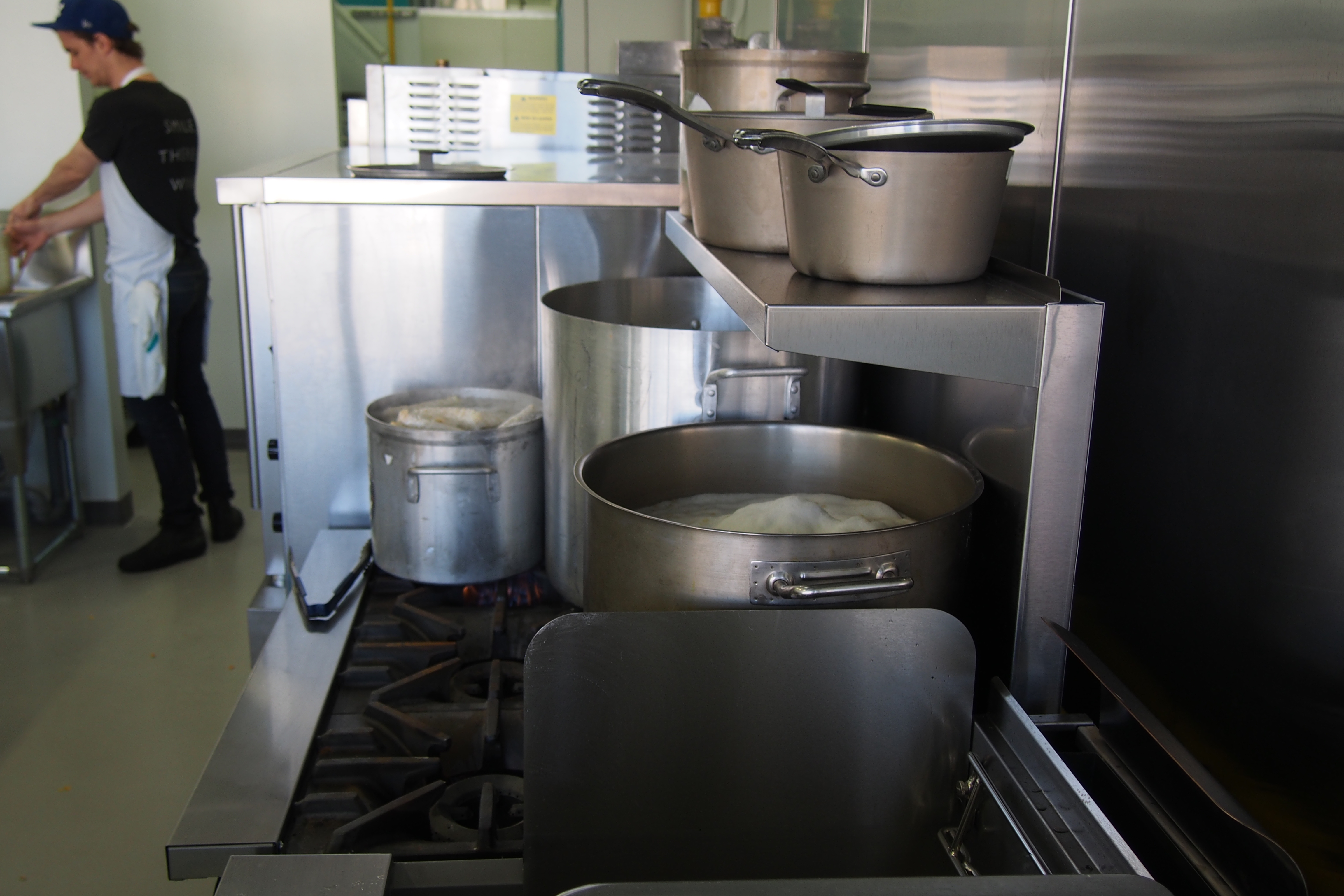 March 27, 2016March 27, 2016 by thecauldronkitchen Cauldron Photo under the hood vent, pots are filled with water and veggies